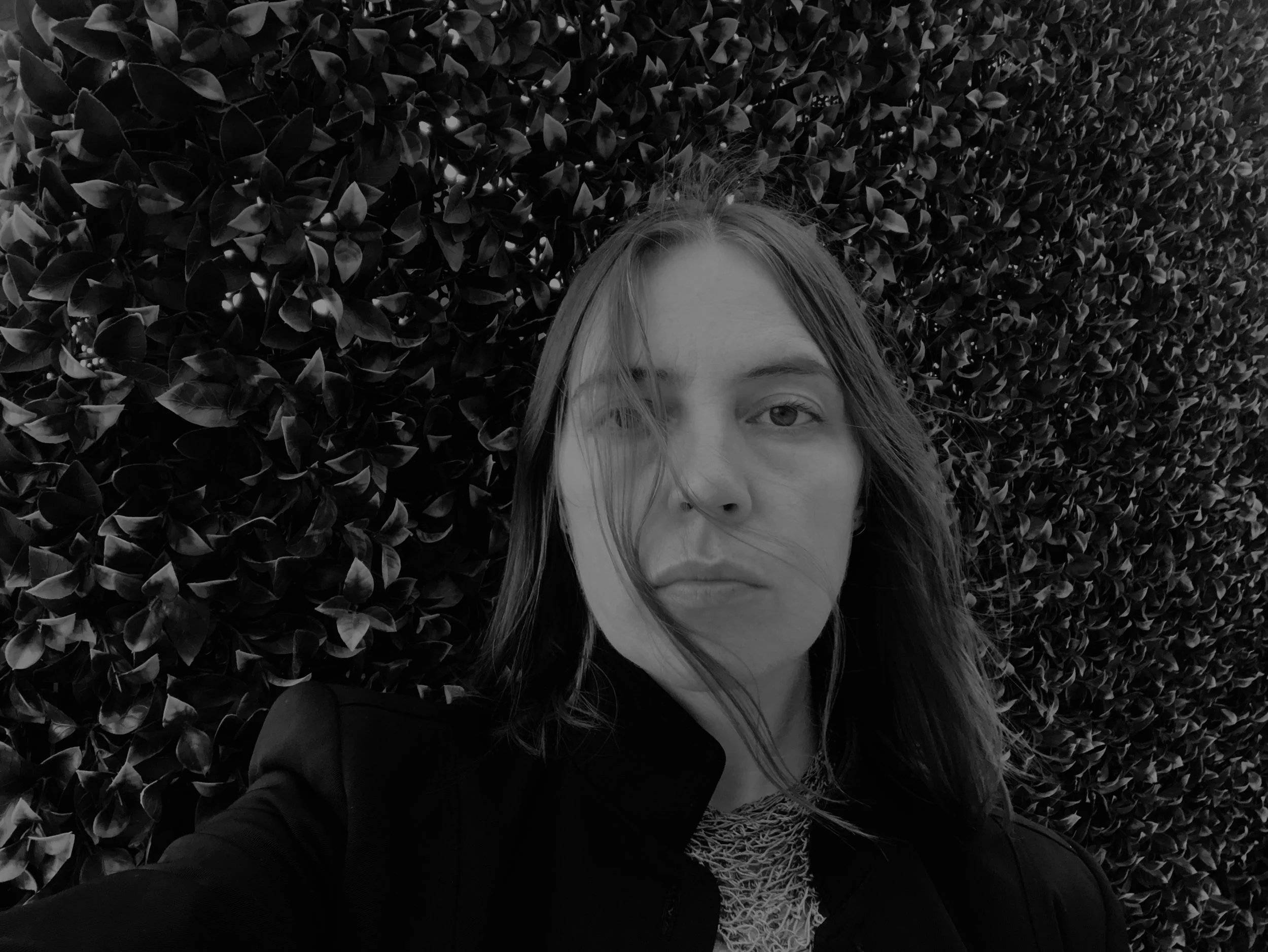 Self Portrait in front of a wonderful wall of hedges on an equally wonderful windy evening after attending an art show in Dallas, TX.